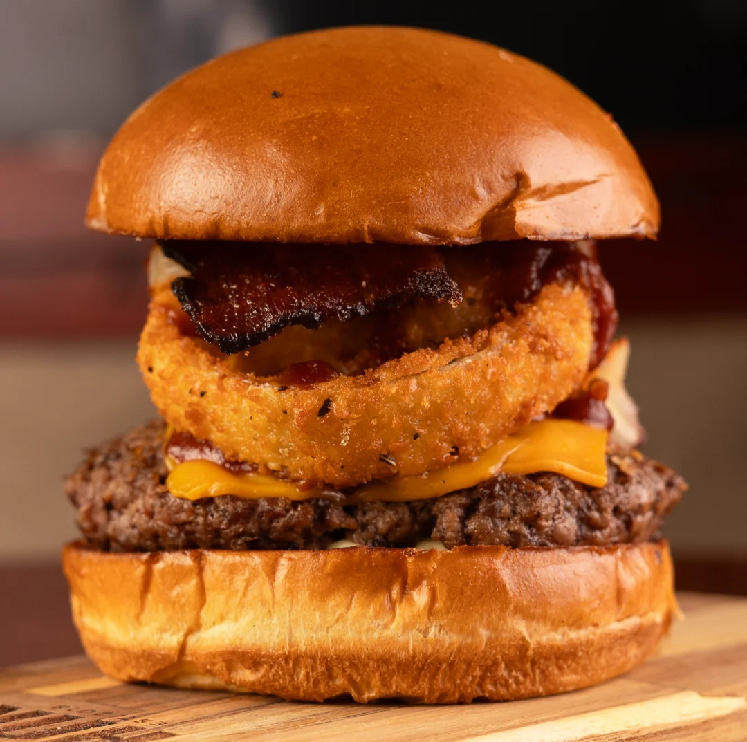 Pão brioche, blend bovino da casa, queijo cheddar, bacon crocante, anéis de cebola empanados e maionese da casa.